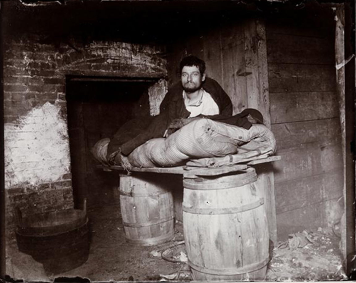 A man atop a make-shift bed that consists of a plank across two barrels, Jacob Riis, 1890.